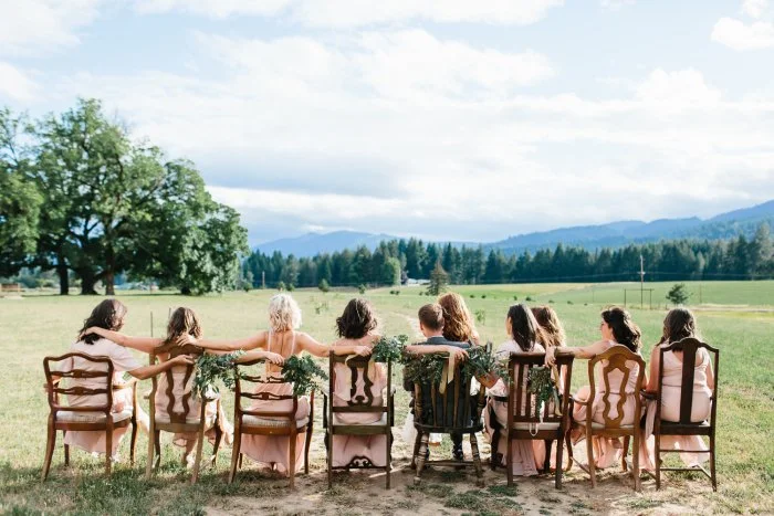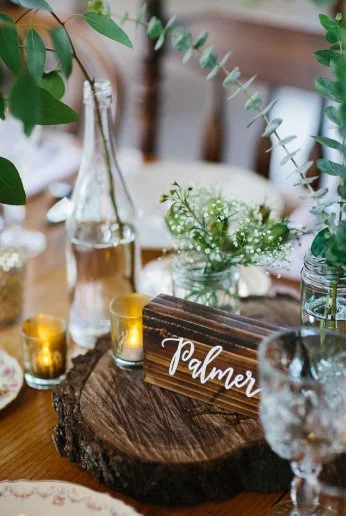 “Tin Roof Barn was so beautiful on its own, we didn’t feel like we needed to add a ton of decor. We wanted our touch to blend into the natural beauty of the setting. The details we added were the most special to us – and it was truly a team effort! My wonderful coworker and friend put together the most beautiful flowers – mostly eucalyptus with some shades of pink to tie in with the bridesmaid dresses. My aunt made the table names which included the names of places that were special to us: ski runs, trails, summits, train stations, etc. Andrew’s dad cut the beautiful Nebraska black walnut slices himself and drove them all the way out to Oregon! When we first asked him if he could find us some wood slices, he thought it was a joke, but once he saw it all together, I think he got it!”