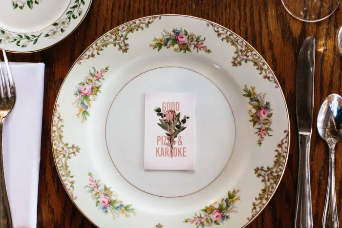 “Andrew is in advertising, so of course he had to give our wedding a ‘brand!’ He came up with, ‘Good Love is Wild,’ which perfectly fit the gorgeous indoor/outdoor venue setting! When we sent out RSVPs, our guests were asked to complete the sentence “Good love is…” We then took everyone’s responses and designed small cards to randomly put at each place setting. It turned out to be really fun – everyone running around trying to find their quote! ‘Good love is catching the keys over the top of the car without saying who’s driving;’ ‘Good love is a cold morning in the back of a truck;’ ‘Good love is Albertacos;’ ‘Good love is co-custody of Marv…’